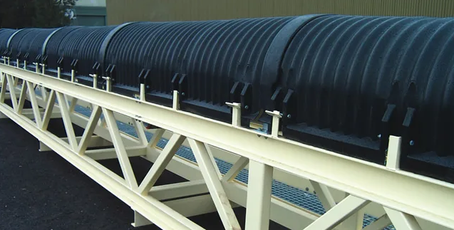 Главная сфера использования арочного профнастила МП35ПГ — это защита конвейеров, перемещающих сырьё или готовую продукцию на открытых участках предприятий. Изогнутая форма листа позволяет создавать герметичные укрытия, защищающие оборудование от осадков, ветра, пыли и солнечного излучения. Это особенно важно для угольных, цементных, металлургических и горнодобывающих предприятий, где непрерывность работы конвейеров напрямую влияет на производительность.