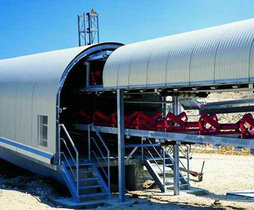 - Укрытие конвейеров. Профнастил эффективно защищает транспортные линии от осадков, пыли, ветра и солнечного излучения на горно-обогатительных, цементных, металлургических и перерабатывающих предприятиях.